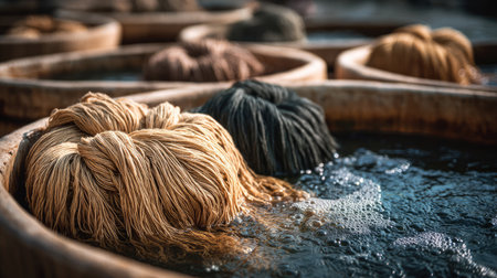 Explore the intricate process of dyeing natural fibers in large bowls filled with water, revealing vibrant colors and unique textures in this artisan craft.
