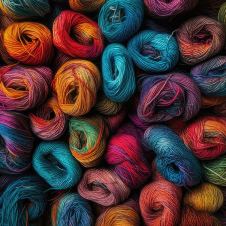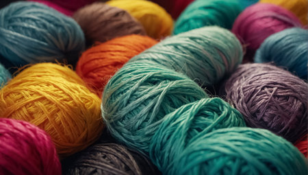 Close-up view of vibrant yarn spools showcasing a range of shades perfect for various crafting projects. Ideal material for creating textiles and accessories.
