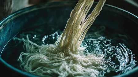 Captivating close-up of freshly made noodles being pulled from a water bowl, highlighting the intricate texture and dynamic motion in a rustic kitchen setting.