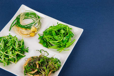 Spring vegetables and herbs, close up of nutritious greens sprouting in spring. 065