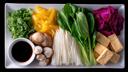 This stunning image showcases a beautifully arranged bowl of Asian cuisine, featuring fresh vegetables, tofu, and flavorful sauces, perfect for culinary enthusiasts.
