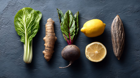 Bok choy, ginger, beet, lemon, and cacao pod are arranged on a dark textured surface, suggesting a focus on natural ingredients for detoxifying drinks, juices, smoothies, or herbal infusions
