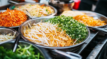 A vibrant arrangement of fresh vegetables and noodles creates an eye-catching dish, perfect for healthy meals and culinary exploration. Ideal for cooking inspiration.