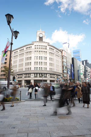Tokyo, Japan - January 14, 2010: Pedestrians crossing the street at the heart of Ginza District in Tokyo. Ginza crossing at night. Blurred motion.