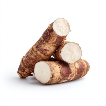 Cassava roots laid out on a white background, showing rough textures with clean studio lighting.