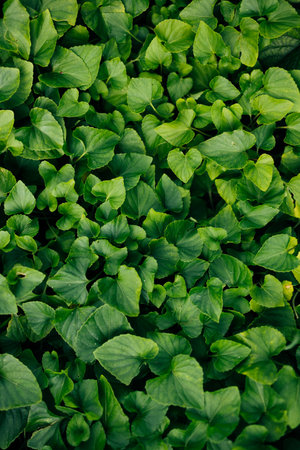 Green plant leaves background, top view. Nature spring concept.