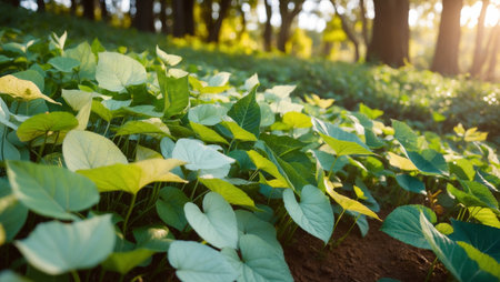 AI Generated. A field brimming with leaves bathed in sunlight filtering through the trees behind