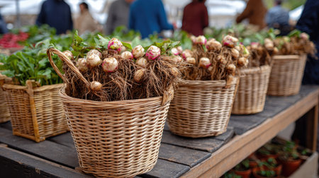 A display of freshly harvested radishes with earthy roots in woven baskets at a bustling local market, highlighting the connection between farming and community.