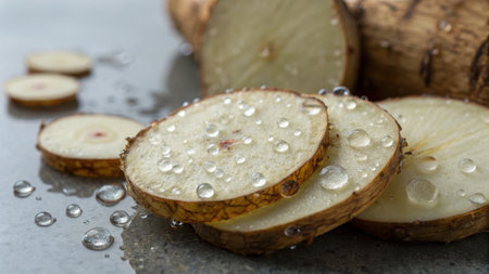 Close-up of freshly cut yucca root slices with droplets of water, showcasing a fresh and healthy ingredient for culinary creations.