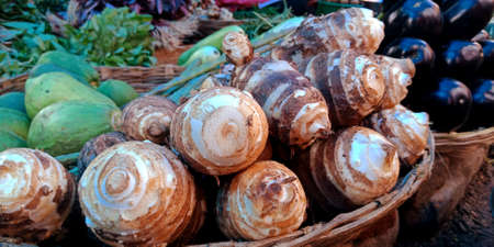 some taro roots display on market place