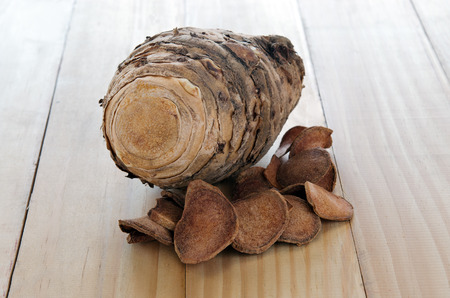cooked taros with rough shell on wood block