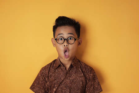 Portrait of funny young Asian boy looking at camera with open mouth and big eyes, shocked surprised expression against yellow background