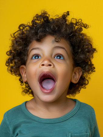 A young boy with curly hair joyfully opens his mouth wide, highlighting his excitement against a bright yellow backdrop.