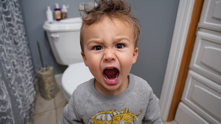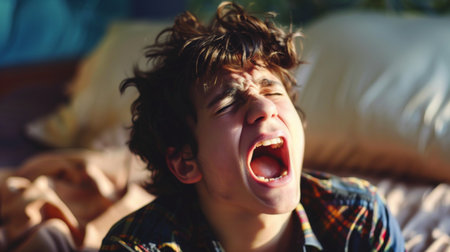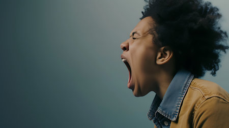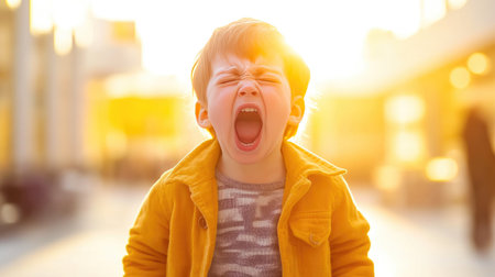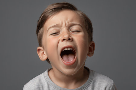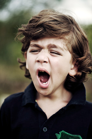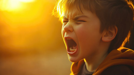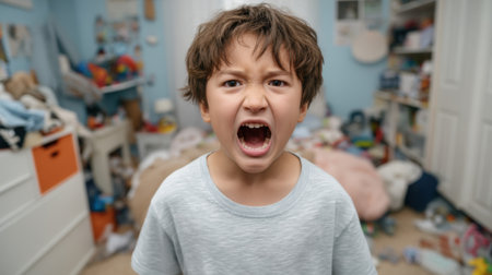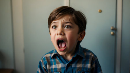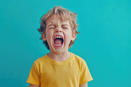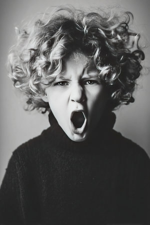A child with curly hair screams in rage embodying a moment of pure frustration and emotion. Tears and a look of aggression reveal his upset feelings in a simple background.