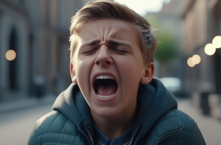 upset Caucasian boy screaming, crying outdoors. shock and emotional breakdown, depression
