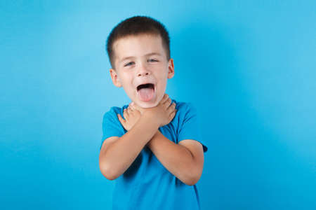 Little boy over isolated background shouting and suffocate because painful strangle. Health problem. Asphyxiate and suicide concept.
