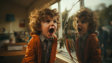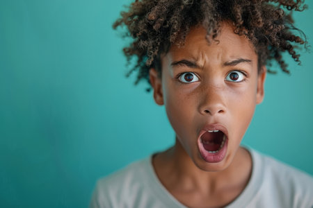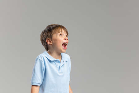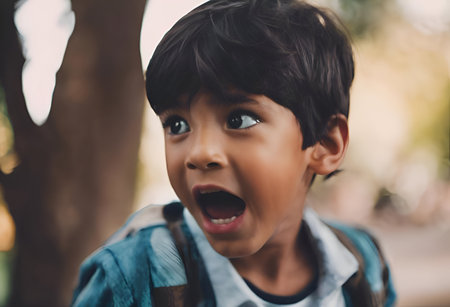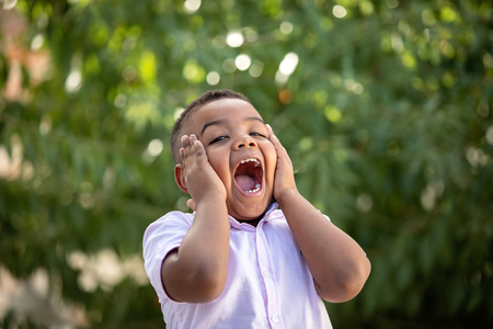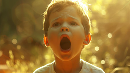 A young boy with his mouth open wide in surprise or excitement. This image can be used to depict astonishment, curiosity, or amazement