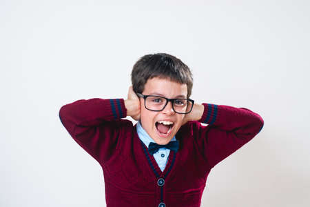 The schoolboy in glasses and a red sweater stands with his hands over his ears and shouts.