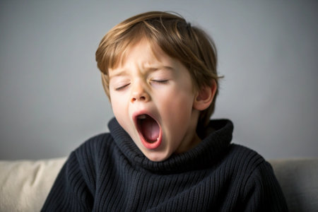 Sleepy young boy yawning while holding a book and sitting on a cozy armchair in soft morning sunlight.