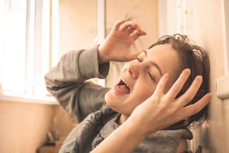 Portrait of a boy in the household environment of the apartment. The child is happy and showing tongue.
