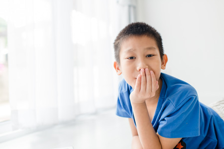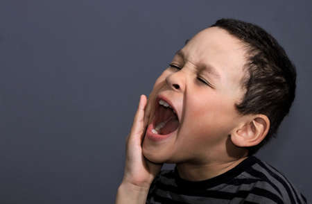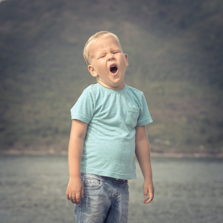 the boy in the blue t-shirt is tired, wants to sleep and yawns