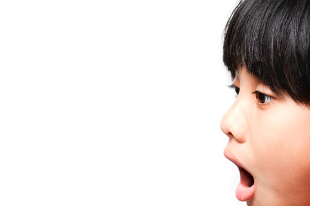 Cute boy in red T-shirt shouting. Speech therapy concept over white background. Front view.