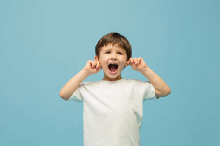 Shouting. Happy, smiley little caucasian boy isolated on blue studio background with copyspace for ad. Looks happy, cheerful. Childhood, education, human emotions, facial expression concept.