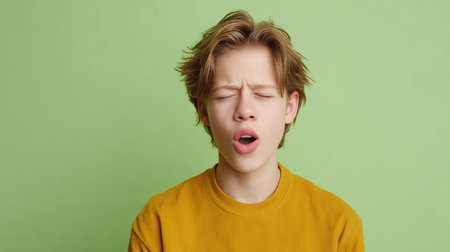 A teenage boy caught mid-sneeze with eyes half-closed and lips twisted, isolated against a pastel green studio backdrop. The image captures an awkward yet humorous moment.