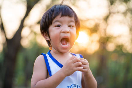Happy facial face boy playing in tree park sunset light Boy in nature