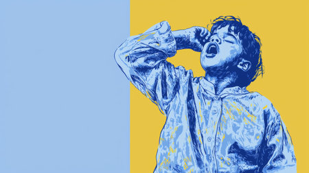 A striking monochrome illustration presents a child's face in a yawning pose against a dark backdrop. The artwork utilizes white lines to define facial features, creating a stark contrast. The composition and lighting create a sense of simplicity and visual impact, suitable for various editorial and design purposes.