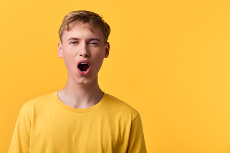 Yawning, surprised man in a yellow backdrop expressing astonishment and energy, wide mouth and alert eyes, casual tee, cinematic mood, ready for lifestyle stock use
