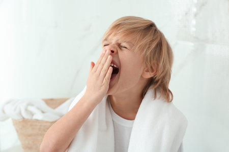Sleepy young boy yawning while holding a book and sitting on a cozy armchair in soft morning sunlight.