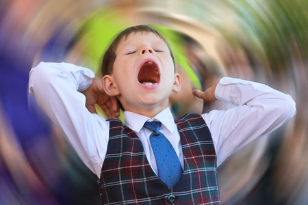 upset Caucasian boy screaming, crying outdoors. shock and emotional breakdown, depression