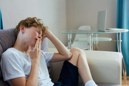 sleepy teenager boy sit alone at home, have some rest, in the morning