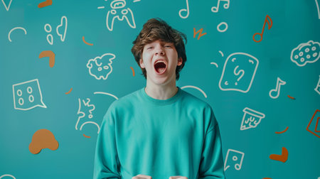 Surprised Teenager Boy with Open Mouth in Front of Turquoise Wall with Drawings, Portrait