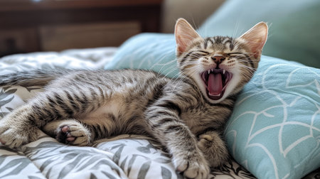 A joyful tabby kitten stretches and yawns while relaxing on a soft pillow, radiating warmth and comfort in a cozy bedroom setting.