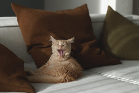 4 months old charming and charismatic ginger kitten yawning on the sofa. Domestic animal concept.