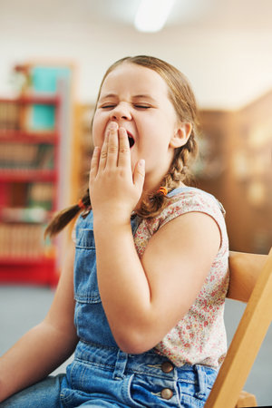 This class is a little boring. Portrait of a tired young school girl yawning with her hand in front of her mouth while being seated inside of a classroom during the day.