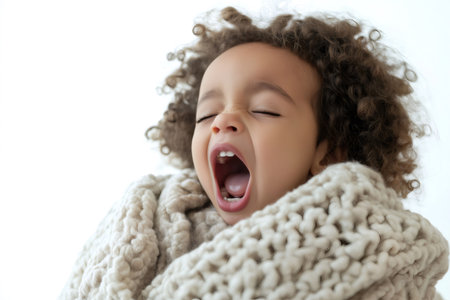 Portrait of a sleepy mixed race child yawning while wrapped in a soft blanket, isolated on white background
