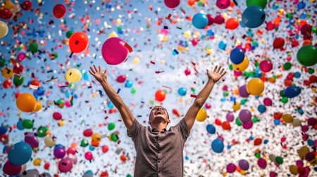 A man joyfully raises his arms in the air as colorful confetti falls around him.