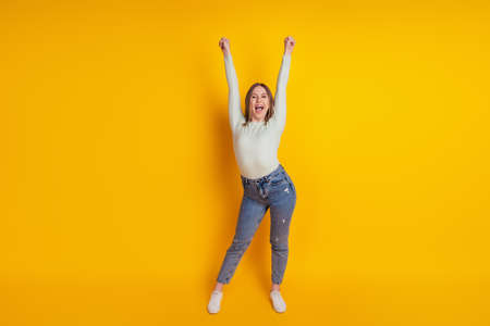 Portrait of delighted cheerful girl raise fists success attainment isolated on yellow color background