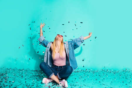 Portrait of nice attractive cheerful cheery glad excited girl sitting on floor rest relax flying decorative elements isolated on bright vivid shine blue green turquoise background