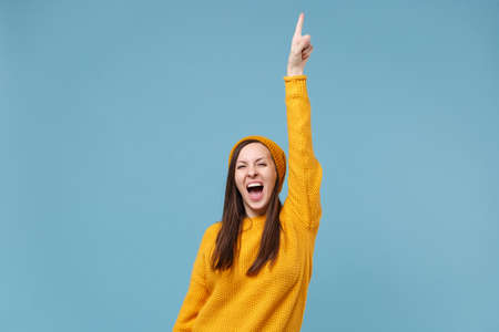 Crazy young woman girl in yellow sweater and hat posing isolated on blue background studio portrait. People sincere emotions lifestyle concept. Mock up copy space. Pointing index finger up screaming.