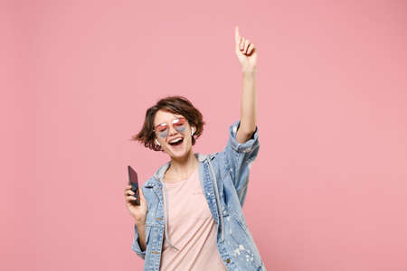 Cheerful young brunette woman in casual denim jacket eyeglasses isolated on pastel pink background. People lifestyle concept. Mock up copy space. Listen music with air pods hold mobile phone, dancing.