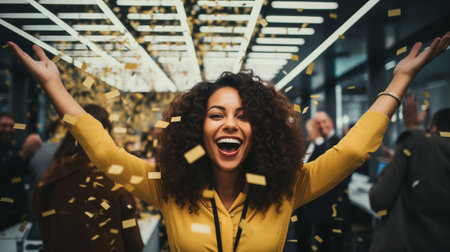 Low angle shot of a cheerful man and woman with curly hair smiling as golden confetti rains down on them in a bright, modern setting. A moment of pure joy and celebration.