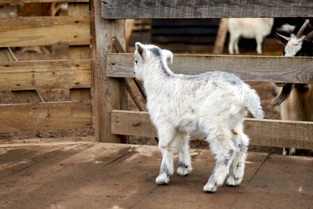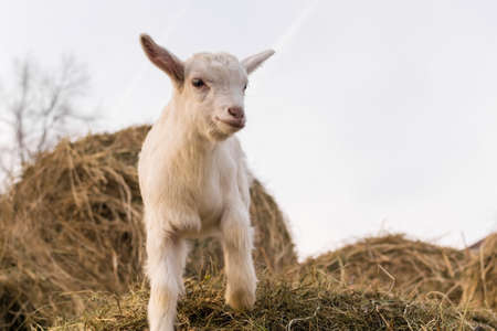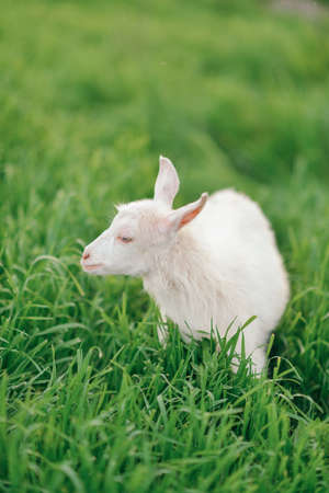 Young cute snow-white goat rests on a summer day in the village. Lamb closeup