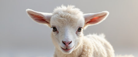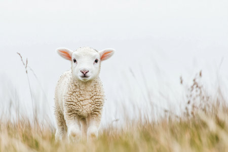 A young lamb in short grass, its fluffy white coat contrasting a blurred white background, creates a serene atmosphere.