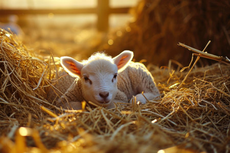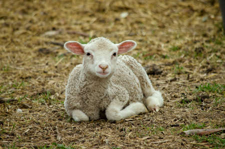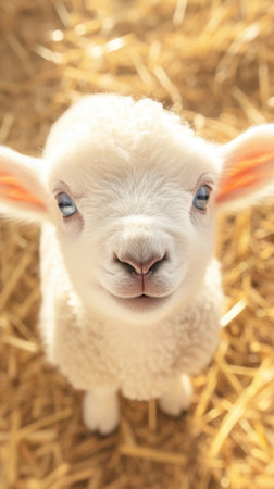 Cute white little baby sheep on dry straw in sunny farm. Easter lamb