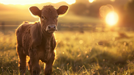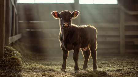 A pedigree calf standing by the farm barn, with soft rays of sunlight casting a warm glow over the scene.