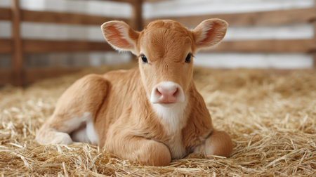 A charming baby calf rests on straw in a rustic barn, surrounded by hay bales. Natural light pours in, creating a serene and peaceful atmosphere ideal for farm-themed projects.